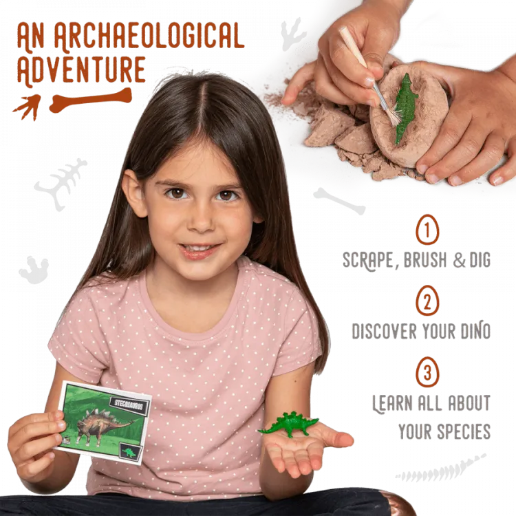 An archaeological digging set of 12 dinosaur eggs. Discover what species awaits inside each egg by chipping away at the egg with the included chisel and brush sets. Dino’s Eggs includes everything you need for a fun-packed activity: a dozen dino eggs--with dinos enclosed, 12 chisels and brushes, 12 informational cards--one for each dinosaur species.